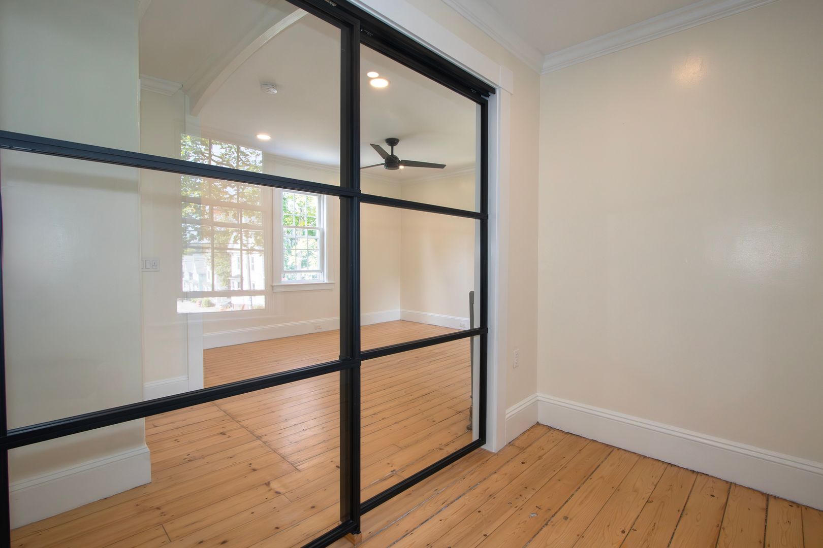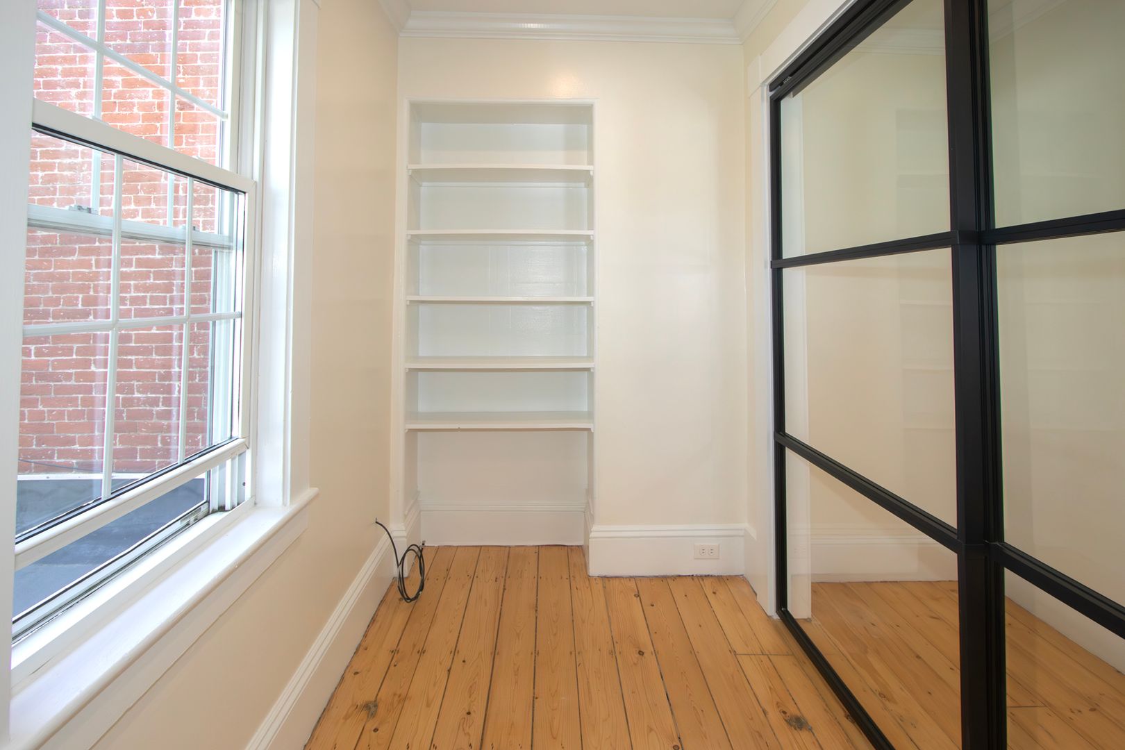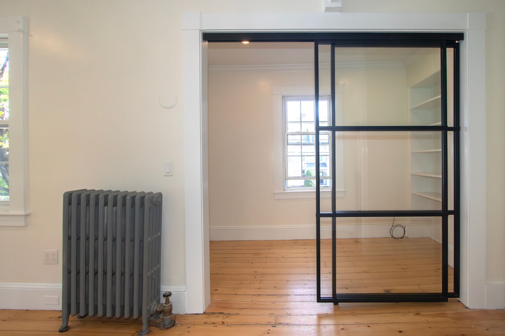 • Glass-enclosed bonus room with built-in bookshelves